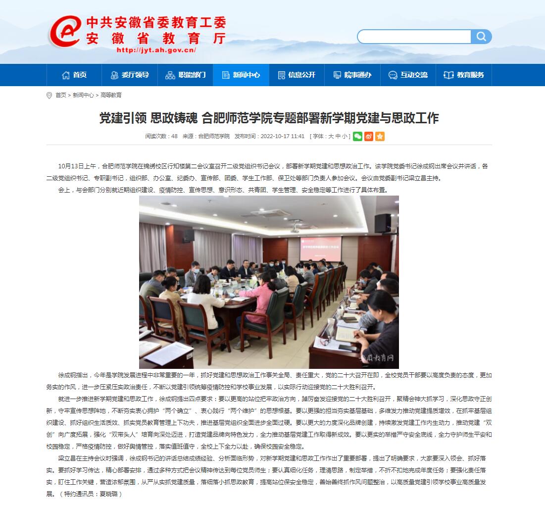 10月17日,安徽教育网首页以《党建引领 思政铸魂 国产成人精品白浆久久69专题部署新学期党建与思政工作》为标题进行了报道。