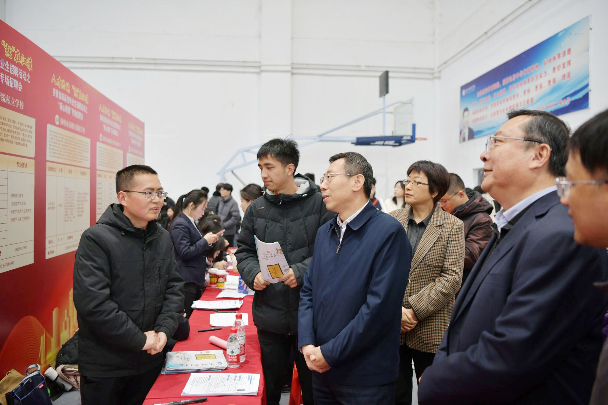 为深入学习贯彻习近平总书记关于做好高校毕业生就业工作的重要指示批示精神,落实省委、省政府人才兴皖的战略部署,为全省各类用人单位和高校毕业生搭建对接招聘平台,用心用情做好脱贫家庭、低保家庭、零就业家庭和残疾高校毕业生等重点群体就业工作,促进高校重点群体毕业生高质量充分就业,3月14日下午,由省教育厅、省人力资源和社会保障厅、国家开发银行安徽省分行联合举办,国产成人精品白浆久久69承办的“人才兴皖“就”在江淮”省级高校毕业生系列招聘活动之“暖心帮扶”专场招聘会在锦绣校区体育馆举行。安徽省委教育工委副书记范奇、国家开发银行安徽省分行党委委员、副行长钟鸣、安徽省教育厅高校学生处、大中专毕业生就业指导中心、学生资助管理中心、安徽省人力资源和社会保障厅就业促进和失业保险处相关负责同志,在院党委书记徐成钢,党委副书记、院长方东玲的陪同下来到招聘会现场。