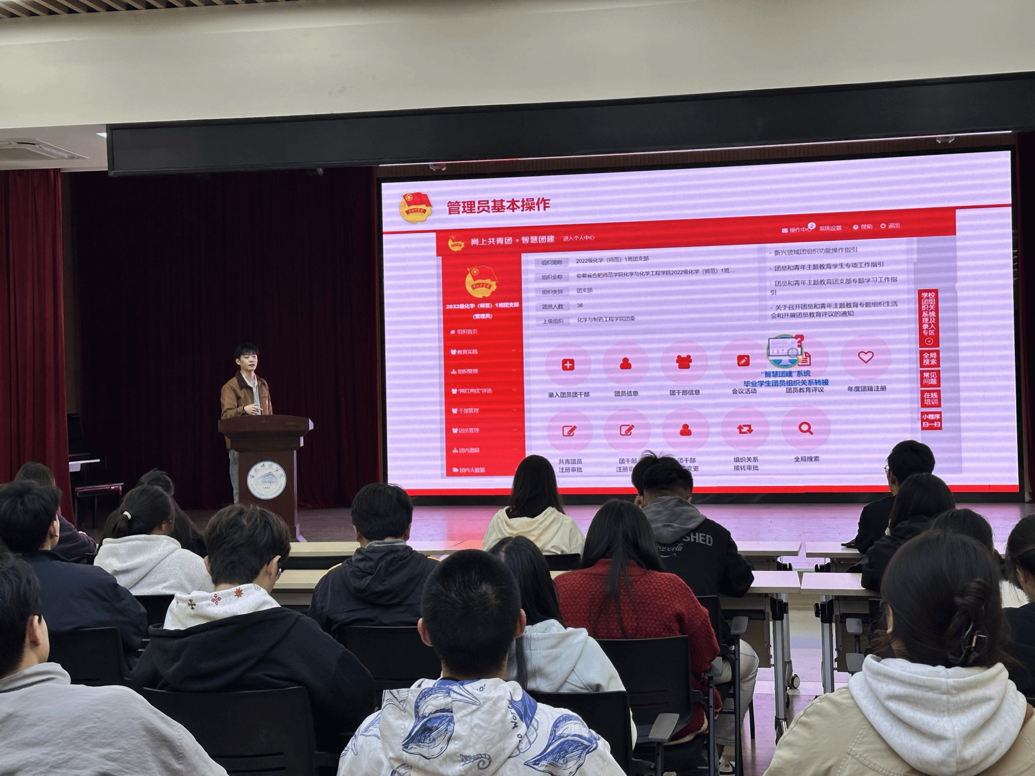 “智慧团建”系统培训围绕组织管理操作、组织成员操作、业务工作操作三大核心模块深入展开。院团委学生兼职副书记王子旭以功能解析和实操演示为核心模式,先清晰介绍系统基本定位与核心功能,再逐项细致拆解操作流程与关键注意事项。培训内容紧密贴合新生团支书实际工作需求,涵盖新生团关系转接所需资料清单、团员信息精准录入实操技巧、管理员日常操作核心要点、专题内容录入规范标准,以及毕业生团员学社衔接全流程等高频实用内容。现场通过PPT直观展示操作界面,结合实时演示同步细致解答疑问。