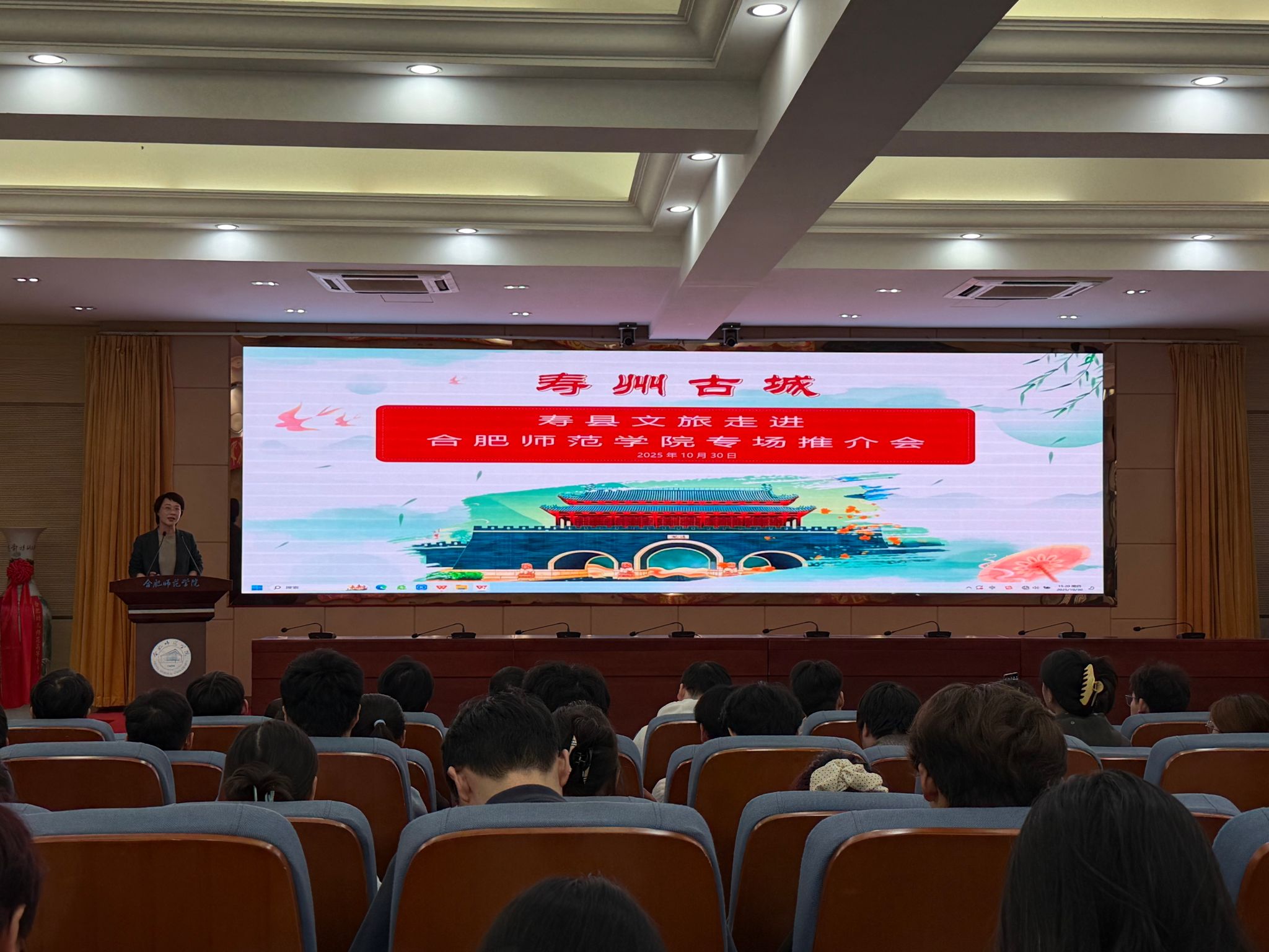 10月30日,学院于学术报告厅举办“下一站·寿县”文化旅游推介活动,以多元形式搭建校地文旅交流桥梁,让学院师生沉浸式感受寿县千年文化魅力。寿县副县长王素苗,院党委委员、副院长周端明及相关部门负责人参加本次活动。
