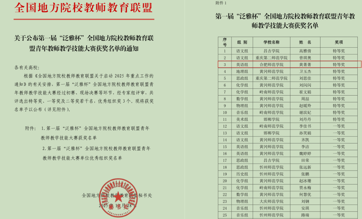 近日,由全国地方院校教师教育联盟主办,肇庆学院承办的首届“泛雅杯”全国地方院校教师教育联盟青年教师教学技能大赛决赛,在广东省肇庆学院落下帷幕。大赛以“深化教师教育改革,服务教育强国建设”为主题,决赛设置课堂教学、主题演讲与现场答辩三个环节,全面考察教师教育教学综合素质。经过激烈的角逐,我校外国语学院黄菁菁老师荣获英语组特等奖、音乐学院谢梦珂老师荣获音乐组二等奖。