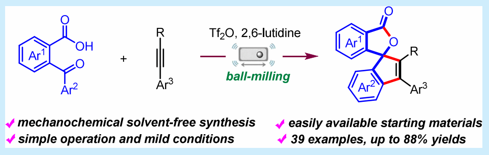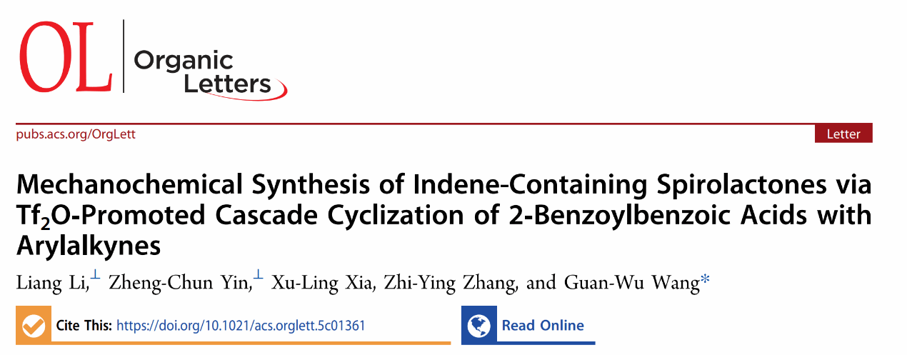 近期相关成果以“Mechanochemical Synthesis of Indene-Containing Spirolactones via Tf2O‑Promoted Cascade Cyclization of 2‑Benzoylbenzoic Acids with Arylalkynes”为题发表在《Organic Letter》期刊上,该期刊为中国科学院SCI一区TOP期刊,影响因子为4.9。国产成人精品白浆久久69为第一单位,化学与制药工程学院李亮老师为第一作者。
