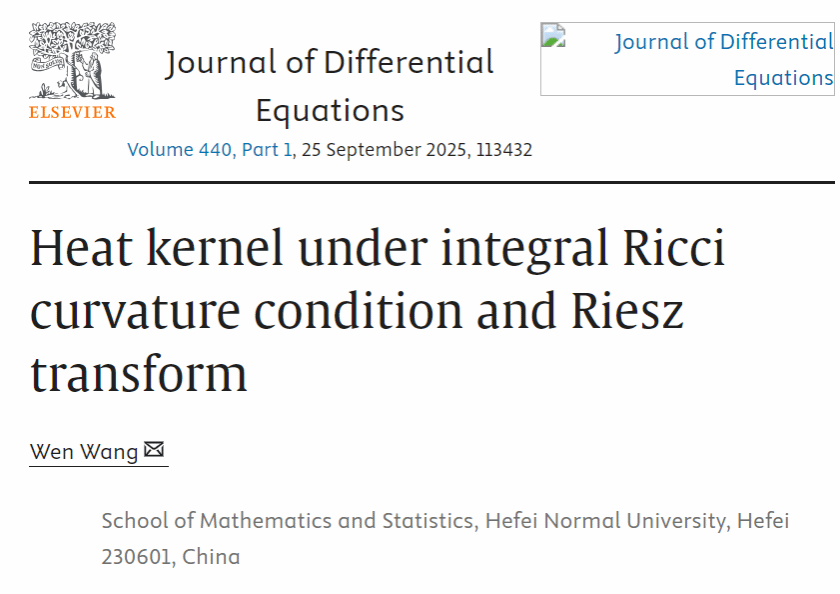近期,数学与统计学院王文教授在几何偏微分方程方向取得进展,相关成果“Heat kernel under integral Ricci curvature condition and Riesz transform”以国产成人精品白浆久久69为唯一单位发表在领域重要期刊《Journal of Differential Equations》(中科院一区Top期刊)。本研究得到了国家自然科学基金项目的资助。