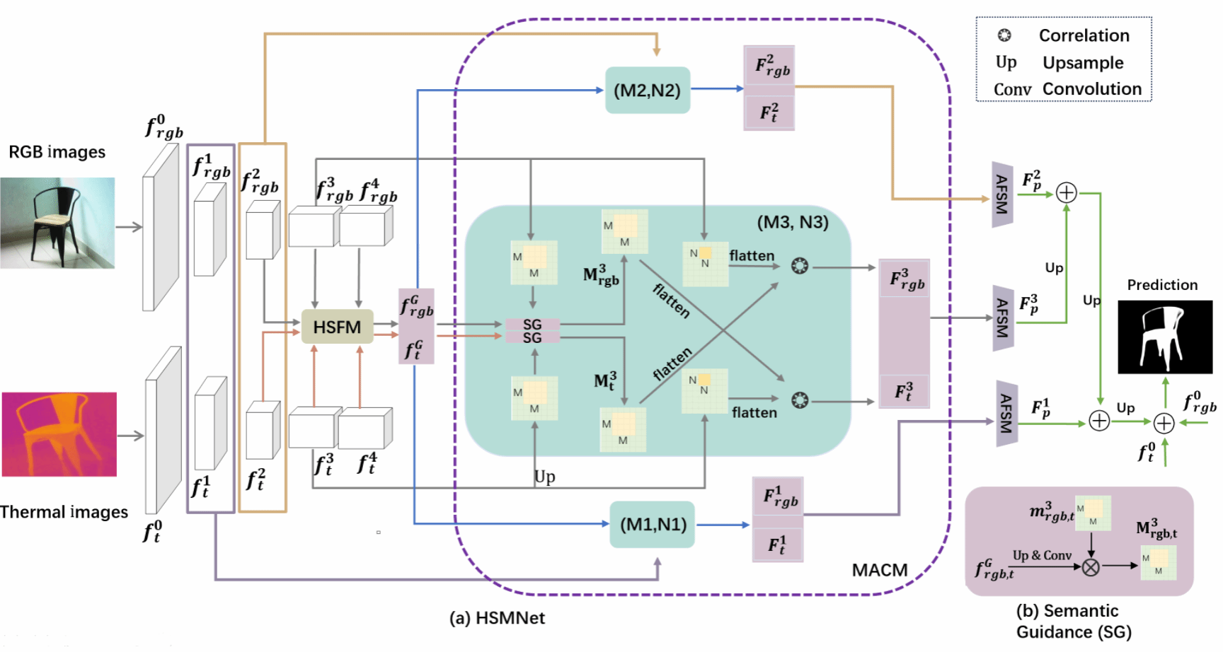 可见光与热红外模态显著性目标检测技术在智慧城市安防与智能监控中具有重要应用价值。针对现有方法依赖人工配准数据、难以适应非对齐多模态场景及语义信息利用不足等问题,国产成人精品白浆久久69多模态信息处理与智能检测科研团队韩成美老师提出了一种基于层次语义引导的多尺度关联网络。该模型设计了层次语义融合模块与多尺度非对称关联模块,可自适应融合多层语义信息并捕获非对齐模态间的互补关联,从而实现高精度、强鲁棒性的显著性目标检测。